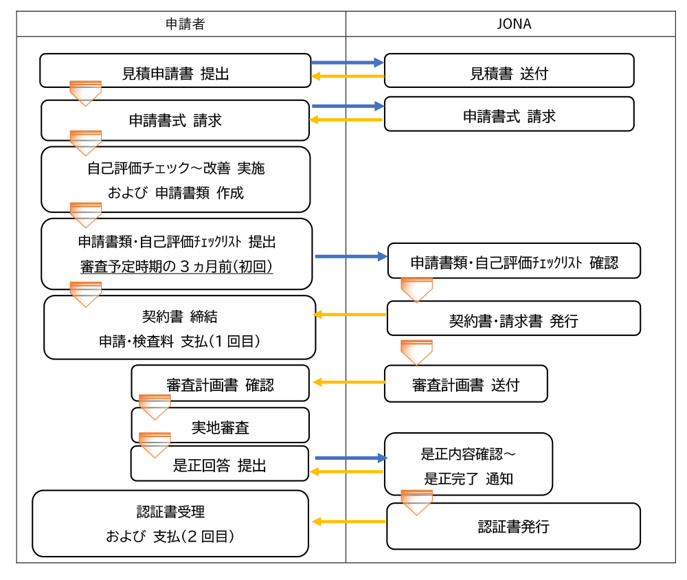 費用は申請内容によって異なります。下記に総額の料金(税込)の例を記載します。これらは低い料金の例で、規模や施設等の状況で費用は増加しますので、JONAの料金表を事前に確認していただくとともに、おおよその費用が知りたい方はJONA事務局まで見積もりを申請してください。
