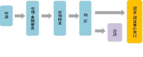 申請書提出→書類審査→実地検査→検査報告書→判定委員会→認証書発行なります。認証までの期間:認証までの期間としては審査に必要な書類がそろってから、3ヶ月以内に認証することを設定しております。