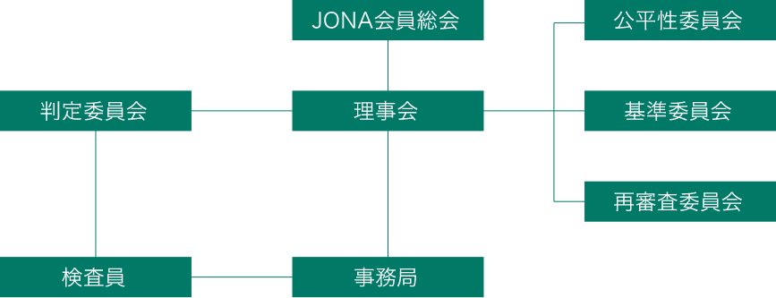 - 基準委員会、判定委員会、再審査委員会、公平性委員会は、JONAの実施する認証の確かさ、利害関係の排除、公平性、公明性が立証できるように組織化されています。